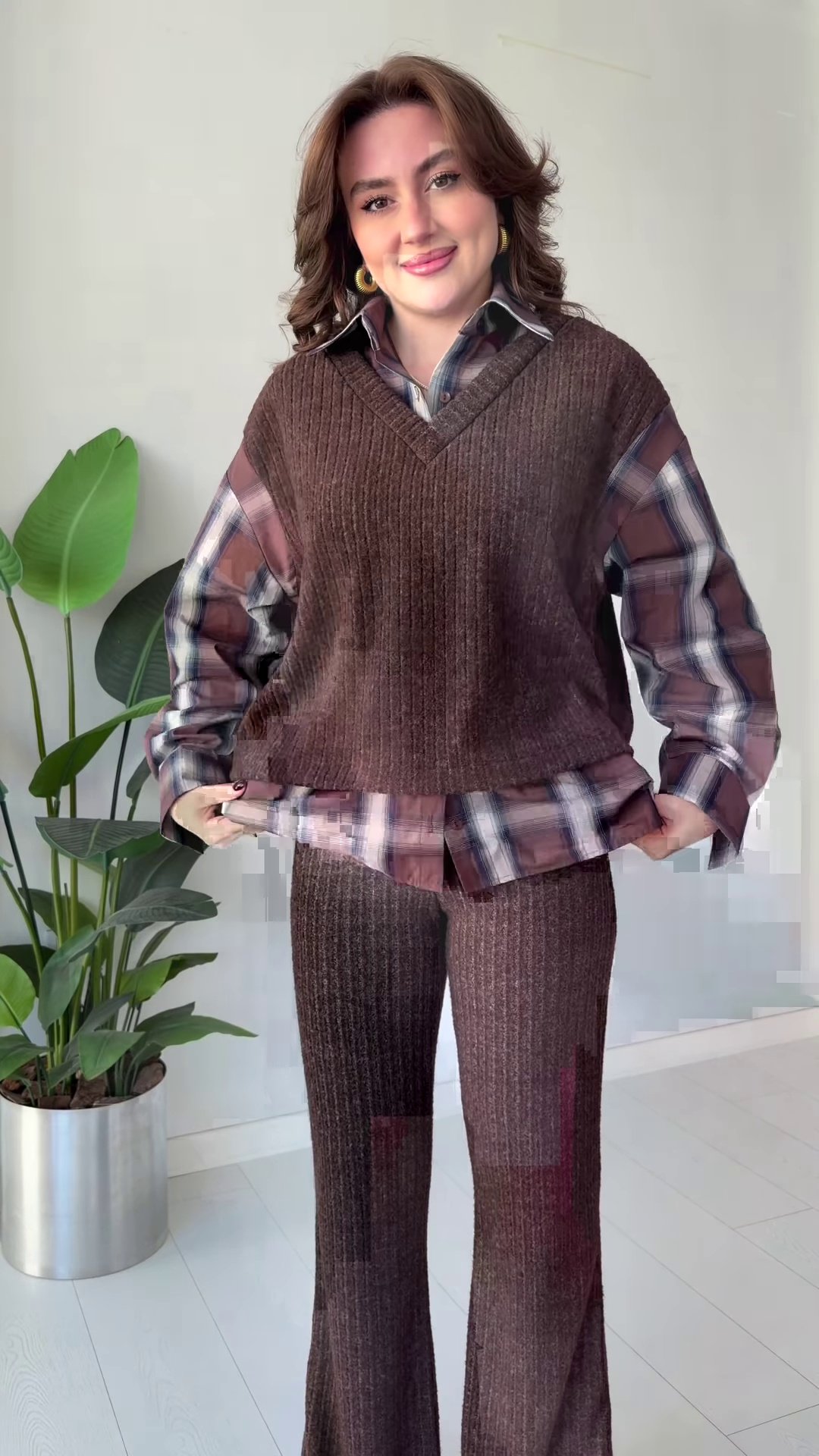 Brown Ribbed Knit Co-ord Set with Plaid Shirt